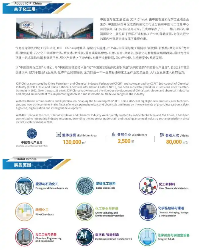 在芯片国产化、新能源爆发的大背景下,电子化学品正迎来黄金发展期。ICIF 2025电子化学品展区将汇聚产业最优质资源,助力企业突破"卡脖子"技术,共享高端制造红利。立即报名参展,抢占市场先机!